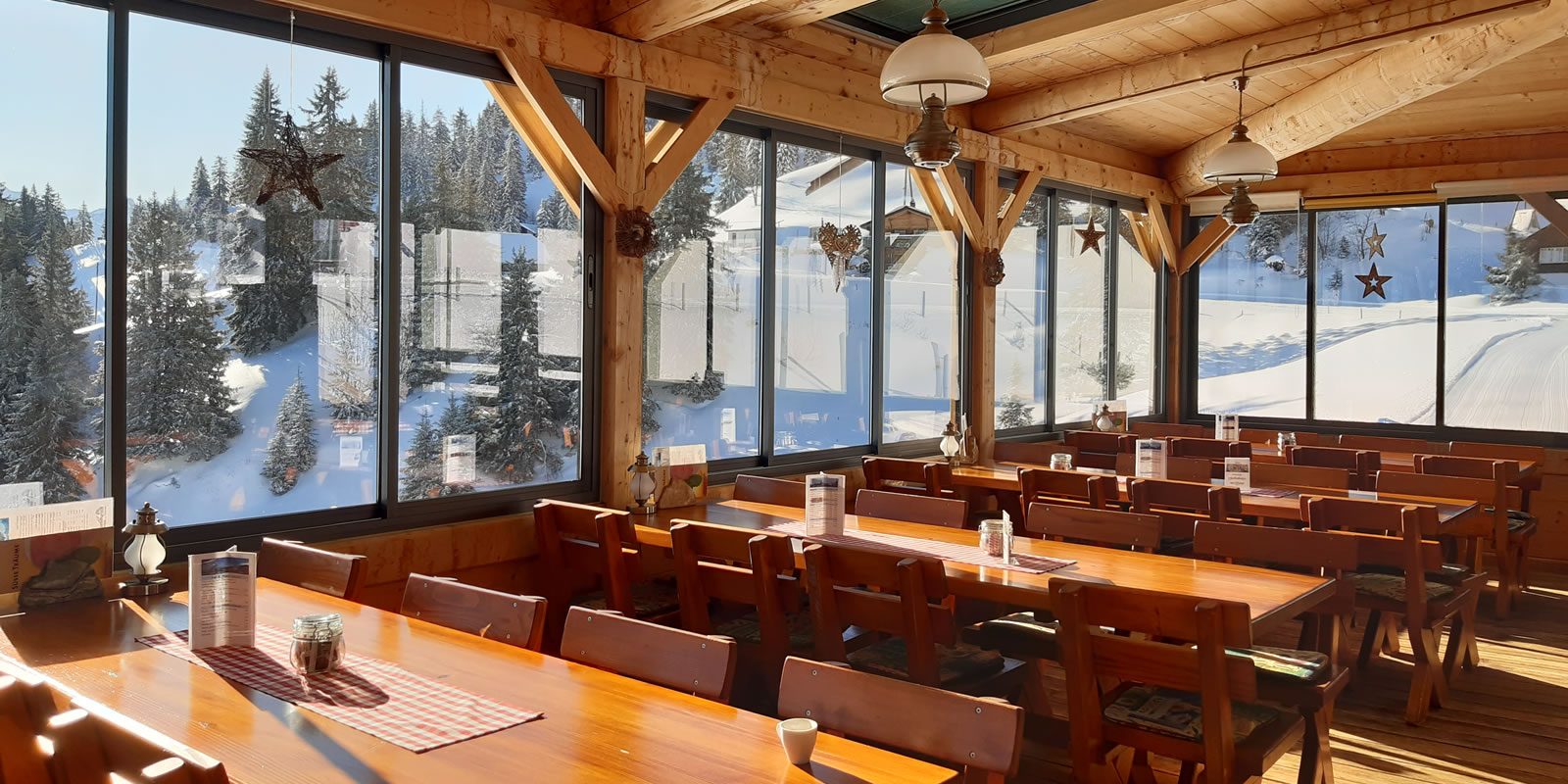 In unserer gemütlichen Gaststube finden 30 Personen Platz. (Wintergarten 50 Plätze) Die heimelige Einrichtung lädt zum Verweilen ein. Der Wintergarten mit den rustikalen Möbeln verströmt urchige Hütten-Atmosphäre. Die grossen Fensterfronten ermöglichen Ihnen einen grandiosen Ausblick in die herrliche Landschaft. Hier sind – bei Normalbestuhlung – 56 Plätze vorhanden. Der grosszügige Raum lässt aber für Gesellschaften vielfältige Varianten mit mehr oder weniger Plätzen zu.